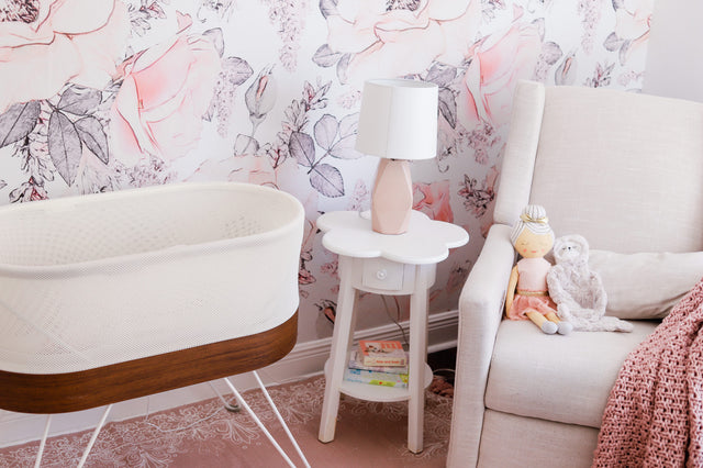 Every detail of this floral pink nursery—from the dusty pink nursery rug to the soft floral wallpaper to the barely-blush table lamp—is soft, sweet, and understated.