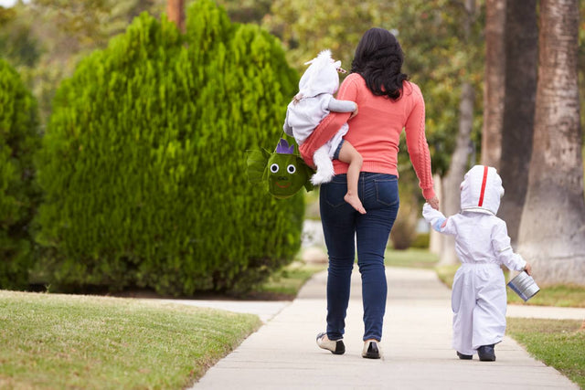 Go early and keep it short! For toddlers and young children, that means heading out as early as 4:30pm or 5:30pm—and wrapping the festivities up within an hour or so. Each neighborhood is different, of course, so it’s always wise to check in with seasoned local parents. Ideally, you want to get in and out before the streets are crowded with older revelers and scary costumes.
