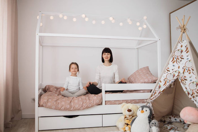 Here’s another excellent, kid-focused mindful meditation to practice at bedtime or naptime from the experts at Zero to Three: Have your little one select their favorite teddy bear or other stuffy and then lie down with their legs straight and their arms at their sides. Take a beat to enjoy the stillness before you place the stuffed bear on the soft part of your bub’s belly. Ask your kiddo to feel the bear’s weight…then instruct your child to “rock” the bear to sleep. To do this, your child needs to take a long, slow breath into their belly…which will make Mr. Bear rise. As the bear goes up, whisper “up.” Then ask your child to exhale even more slowly, feeling their belly—and their bear—go down. As the stuffy goes down, whisper “down.” Ask your tot to close their eyes and continue the slow breathing and whispering for several minutes allowing them to rest and relax.