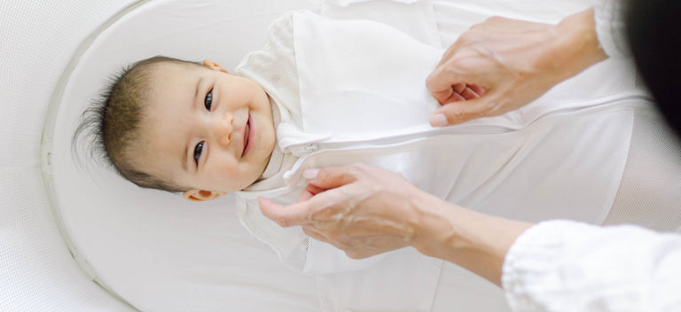 Baby being zipped up in Ivory SNOO Sack in SNOO bassinet